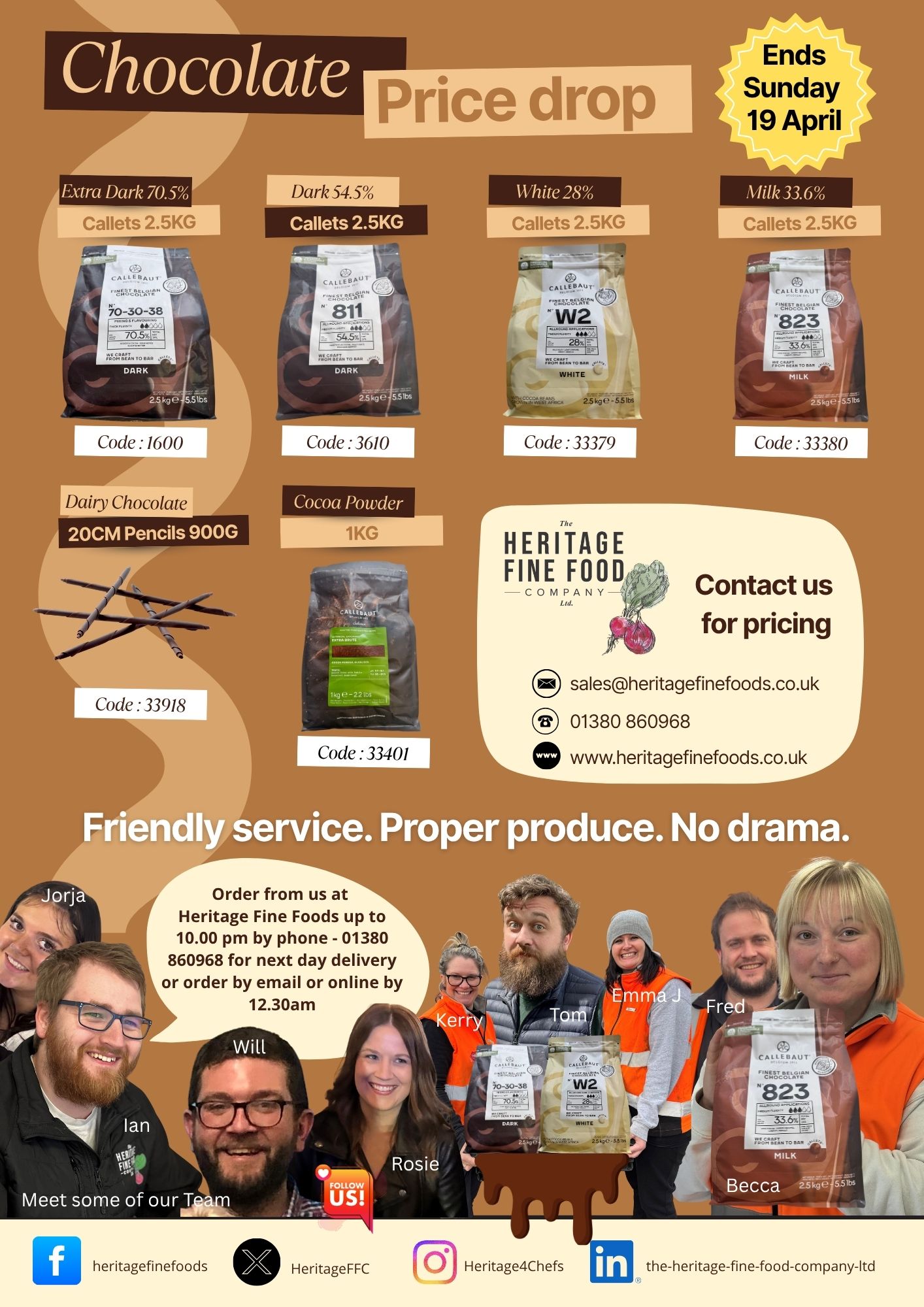 Chocolate price drop Offer ends Sunday 19th April. Call our sales team on 01380 860968, email on sales@heritagefinefoods.co.uk or order…