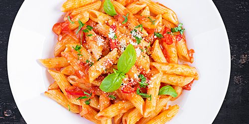 This Creamy Red Pepper Pasta is seriously delicious! Perfectly chewy rigatoni, blistered juicy tomatoes, a creamy-but-cream-less roasted red pepper sauce, all sprinkled with fresh chives and basil.