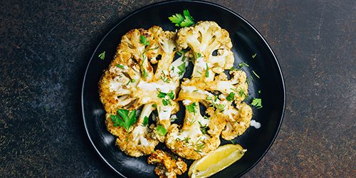 Unlock the flavours of cauliflower with a red pepper, olive and caper salsa, topped with almonds. Healthy and vegan, it makes a tasty light lunch or supper