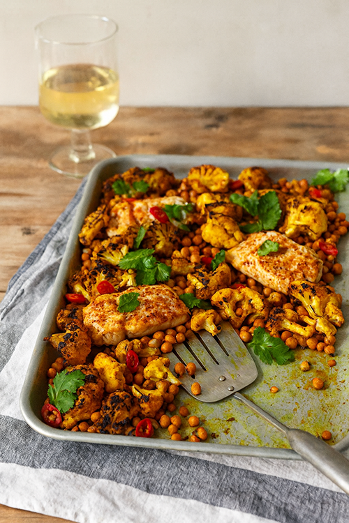 Curried butter-baked cod with cauliflower and chickpeas