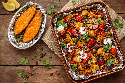 Roasted red pepper and cauliflower harissa traybake