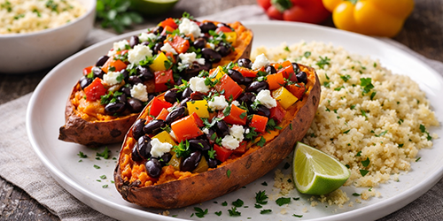 Add the black bean mixture to the top of the potatoes halves, packing to fit. Place filled potatoes back into the oven for 10-15 minutes or until beans are hot.