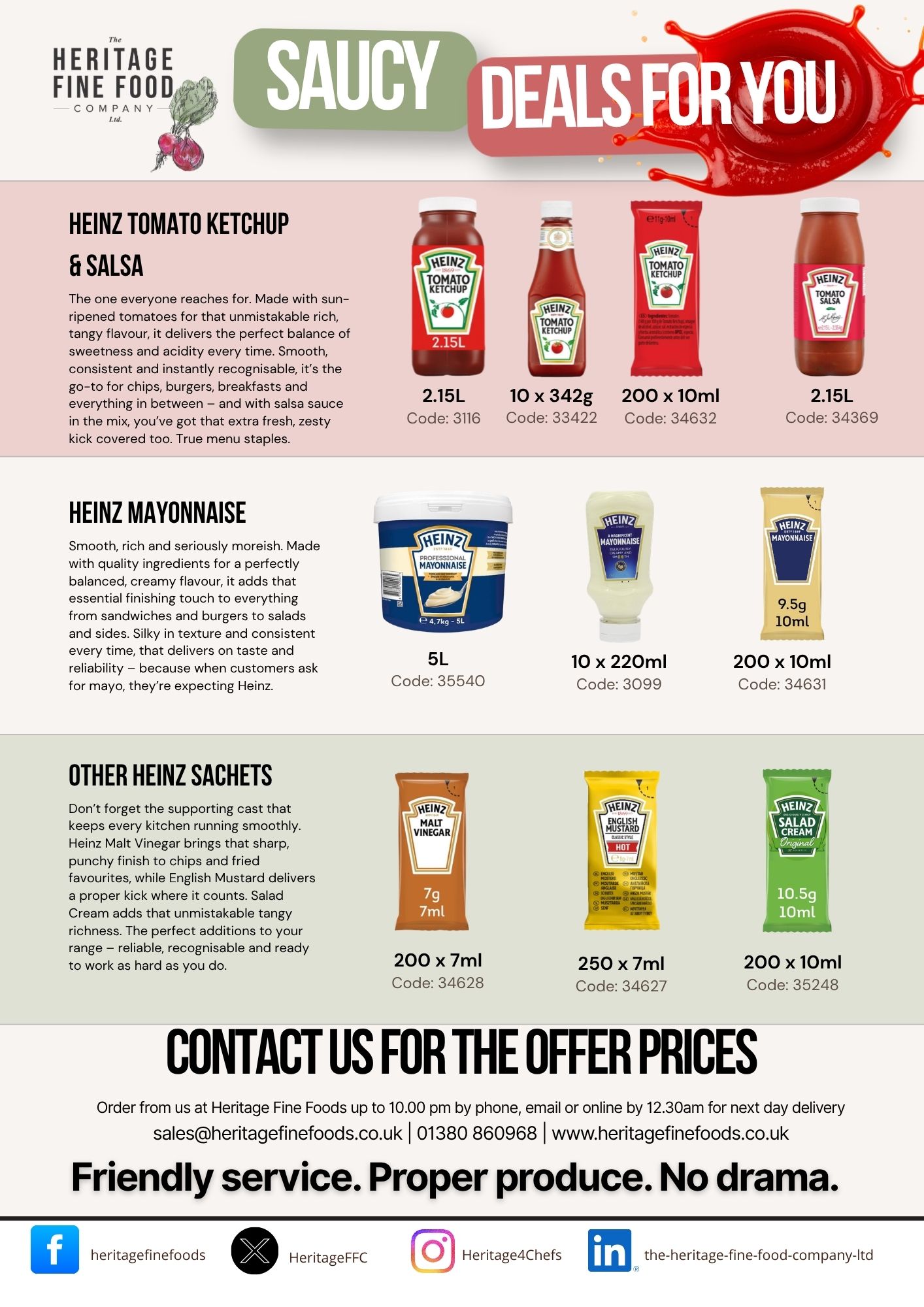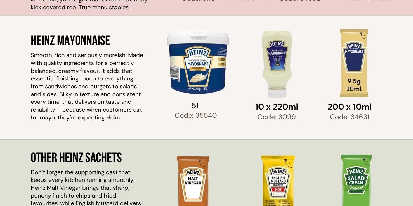 OFFER ALERT – Sun’s out, grills are on and there’s only one name that belongs on the table – Heinz. Whether it’s chips crying out for ketchup, burgers demanding mayo or salads pretending they don’t need a proper hit of dressing, we’ve got your back. Heinz sachets or catering-sizes, all covered in this offer. So go on… grab the deals, stock up and get a little saucy with it. Call us on 01380 860968