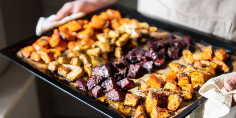 Try this vegetarian roast sweet potato, beetroot and red onion salad with miso dressing out for size. You can roast the veg up to 3 hours ahead and dress and toss before serving.