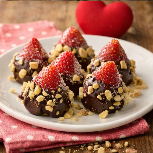 Insert a toothpick into the side of each strawberry. Holding toothpick, quickly dip stem end of strawberry into melted chocolate; allow excess to drip off. Sprinkle with hazelnuts; place strawberries on a waxed paper-lined baking sheet, point side up. Remove toothpicks; refrigerate strawberries until set. Just before serving, dust with confectioners’ sugar.